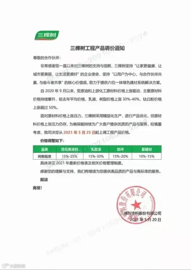 据悉,三棵树涂料在前一周曾发布过一张调价通知对产品进行调涨。调价品类及幅度: