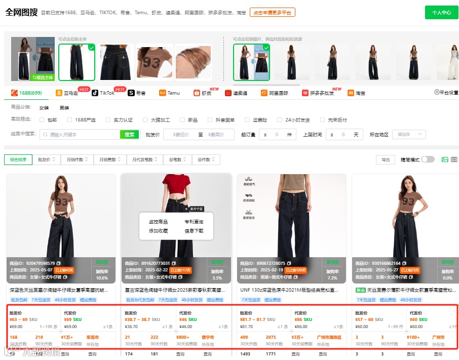 在市场上发现了爆款,想立即跟款,直接上传商品图片或链接,能立即获取1688同款货源商品,通过对比供应商价格,迅速找到高性价比货源。