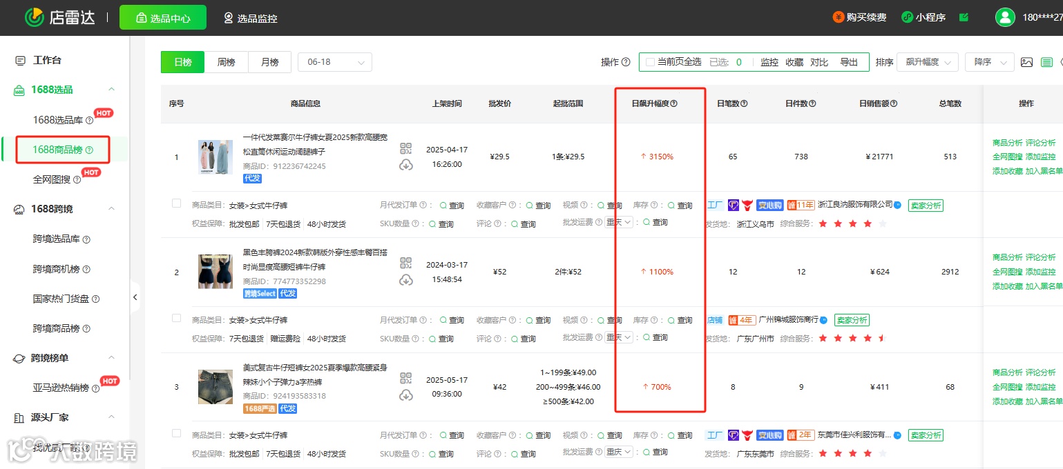 若市场过于为饱和,可以选择目前在拼多多上卖家较少、好评率高的同款/相似款,结合店雷达1688热销榜、飙升榜等,可进一步分析品类的整体增长趋势、验证单品潜力。