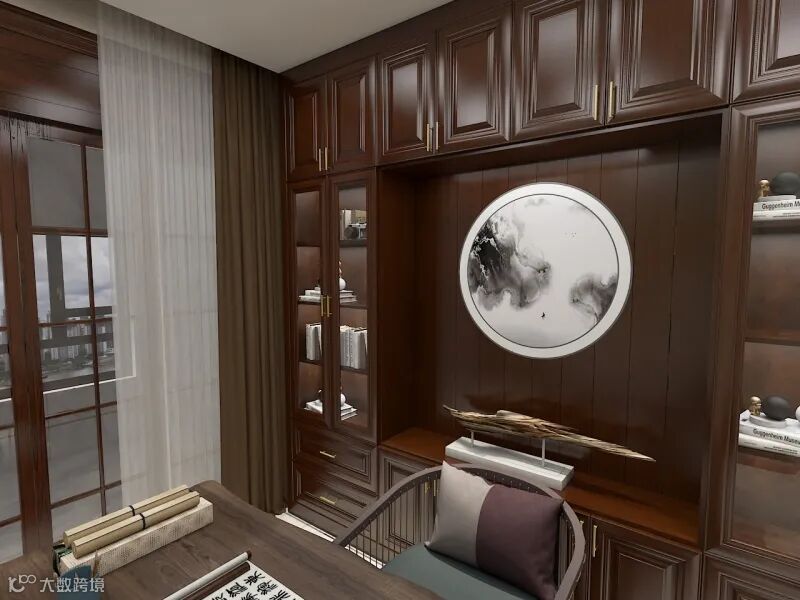 中式书房多以实木为主,将雕刻和彩绘融入家具造型中,典雅而独特。隔窗、屏风是较为常见的设计元素,主色调以深棕、深灰等色调为主。