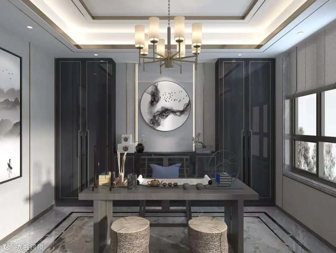 古朴厚重的实木书桌,带有水墨诗意的挂画,外形古典的中式吊灯,处处流露浓郁的中式气息。