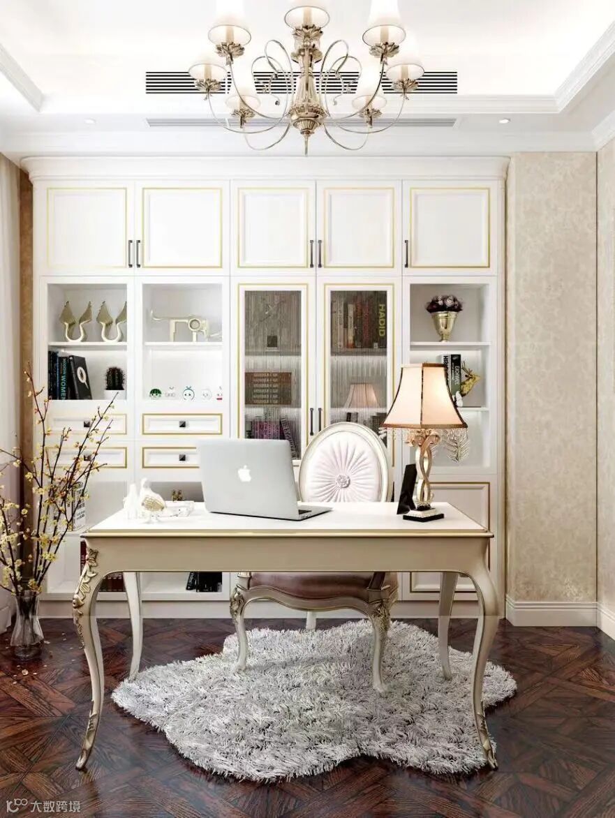 欧式风格书房,在家具造型上,选用木质弧线造型扶手,运用桌脚雕花工艺,优雅精致。