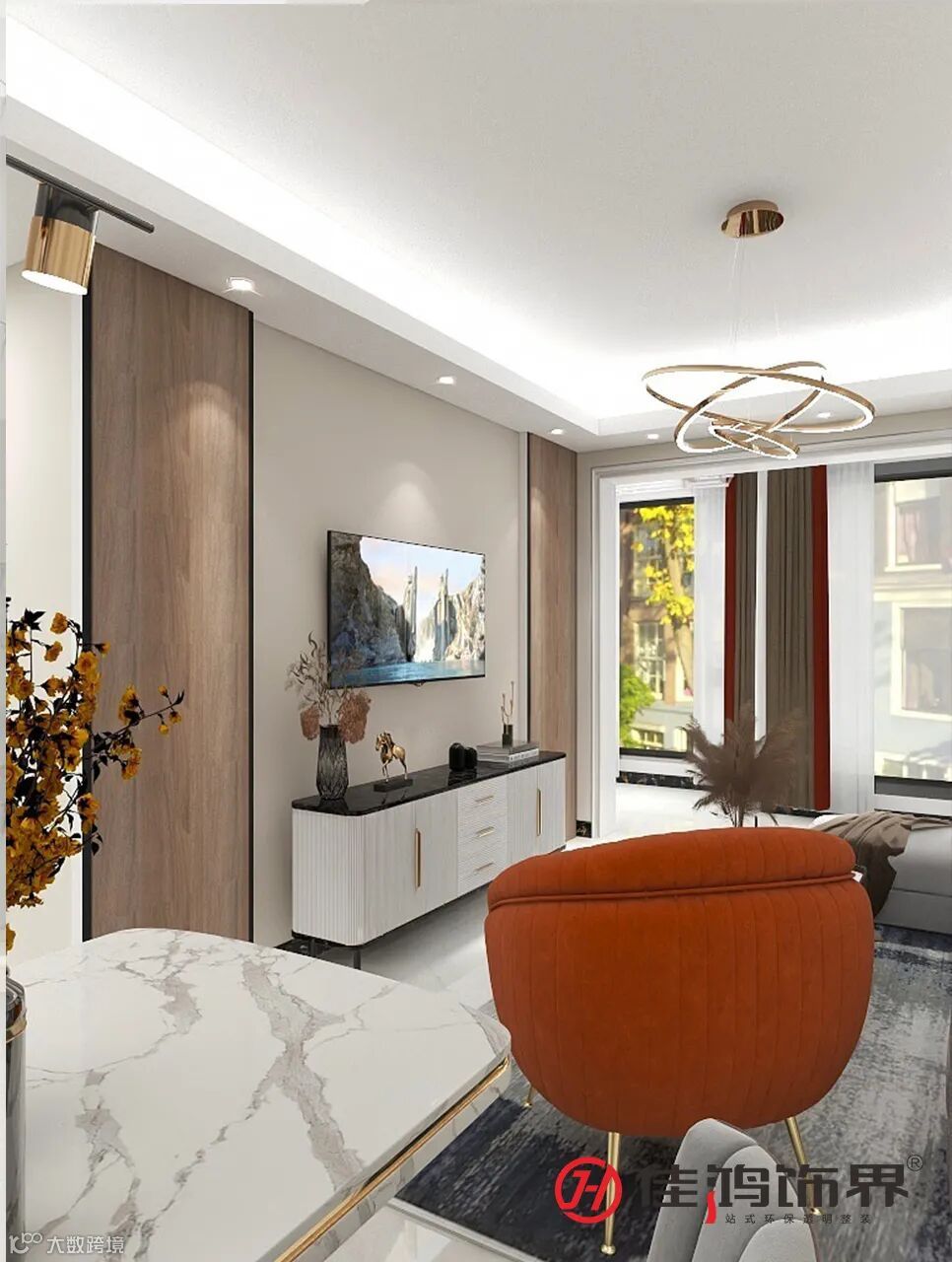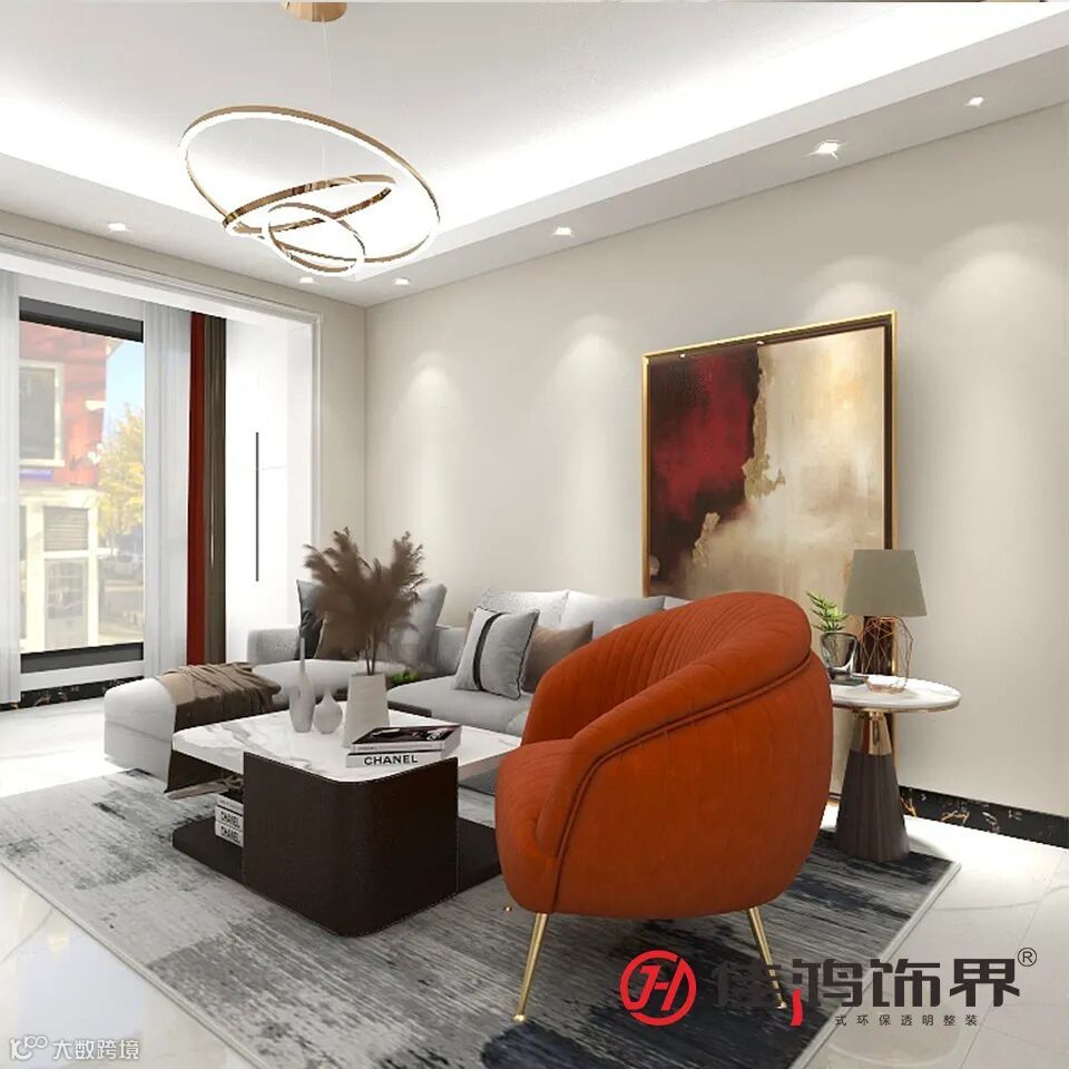 墙上选用简单的黑金框印象风装饰画,软化大面积冷淡铺色带来的板正感。L型的奶灰沙发和爱马仕橙的单人沙发组合,与客厅的整体风格形成统一。