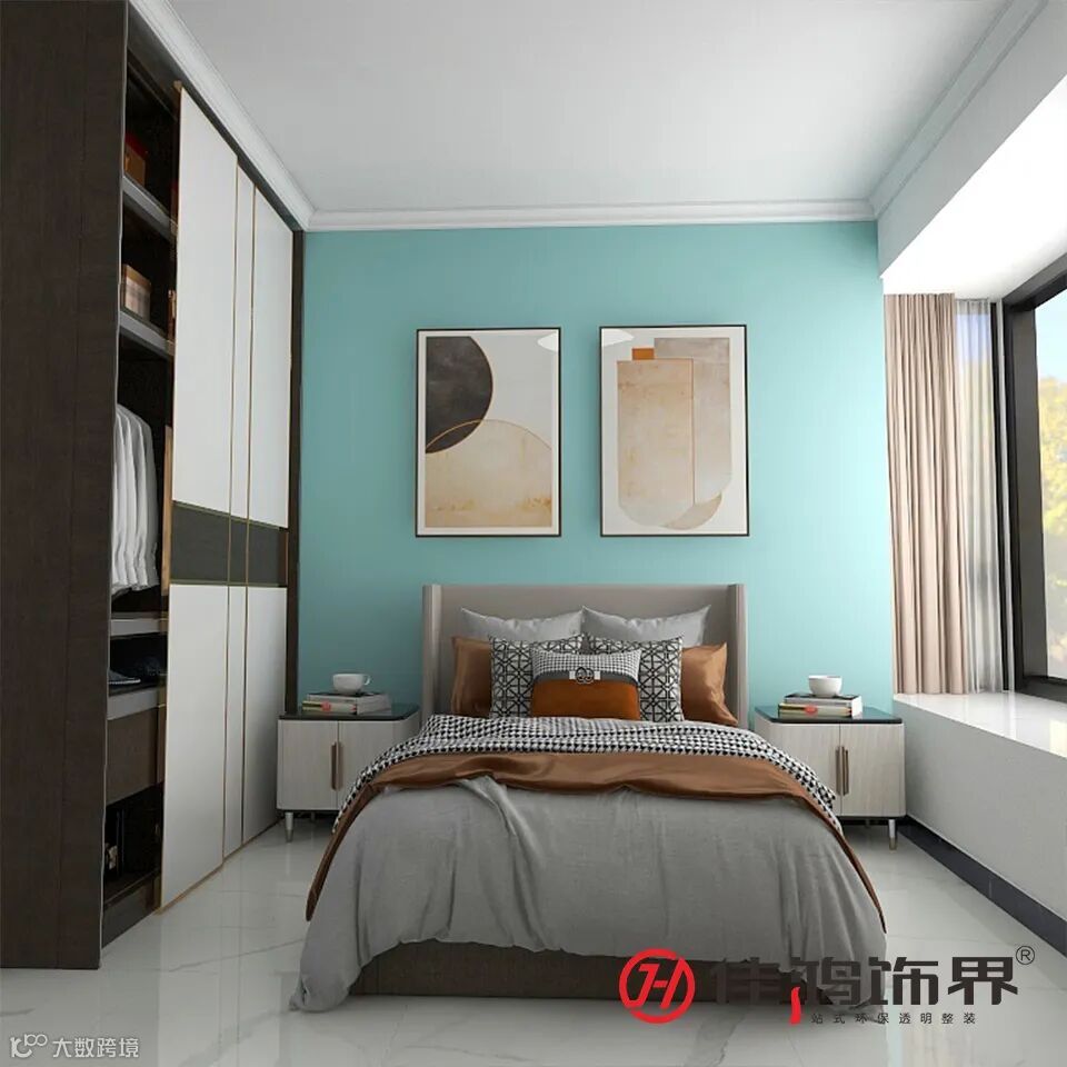 ▲不同于其他空间,卧室利用深浅颜色搭配来打造。浅蓝色的背景墙面搭配胡桃木衣橱和纯棉灰棕色床品,显得沉稳而静谧。纯色的纱帘将整个空间衬托的非常小清新。