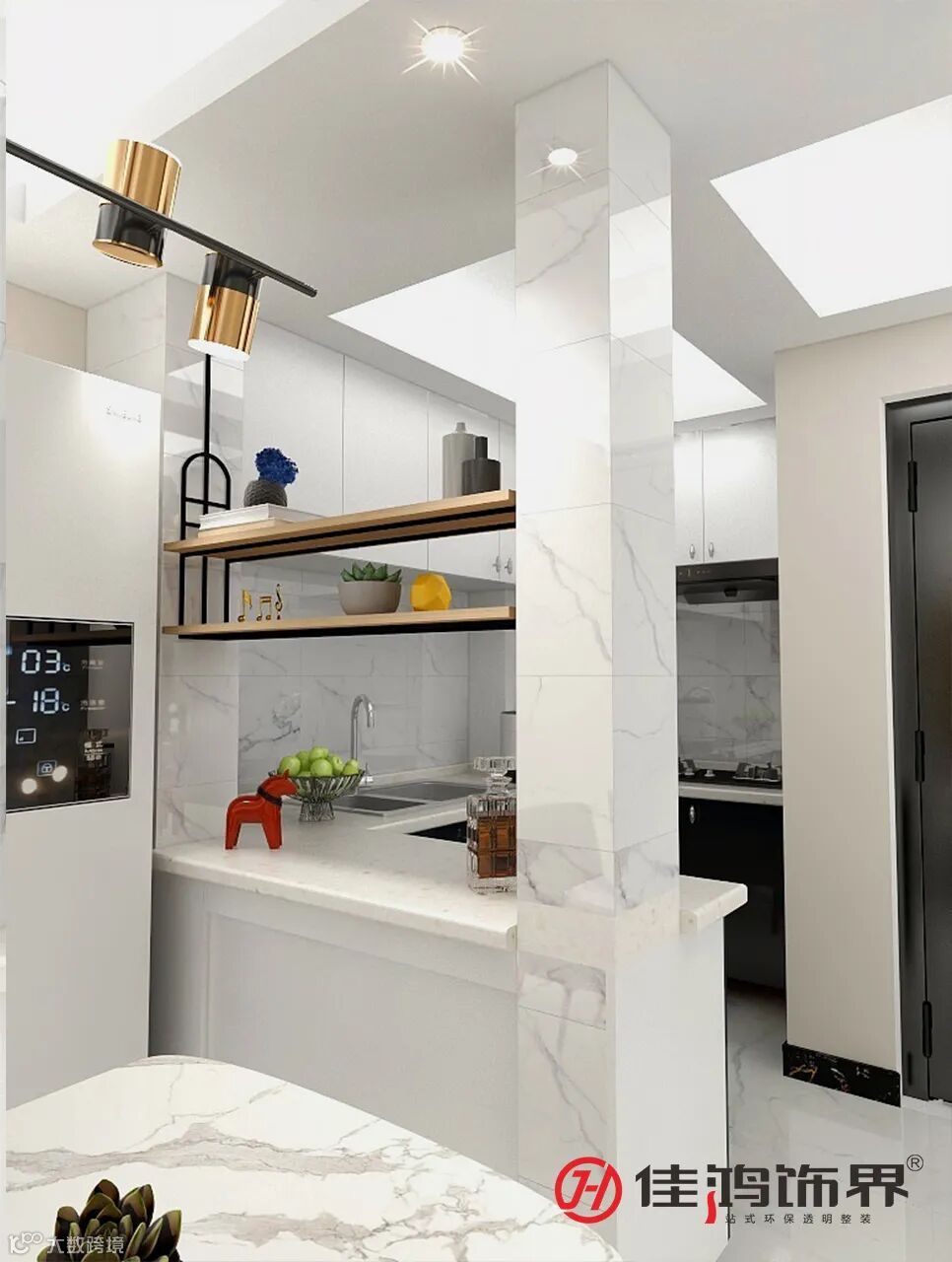 ▲餐厅区域通过吧台与厨房分割,既防止做饭时油烟四溢,又不影响空间的互动性。厨岛一体的设计,既具备吧台和多功能台的功能,又可以方便餐厨区域之间的传菜备菜,提升了空间的利用率。