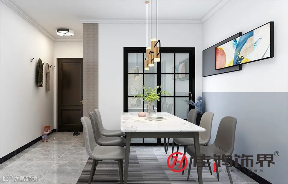 ▲一个有温度的餐厅设计,可以营造让人愉悦的气氛,大理石的桌面和铁艺的桌椅脚,时尚中透着质感,餐桌边缘圆润光滑,使用更方便,不易伤人。色彩挂画和运动健儿的膏像装饰,既丰富了空间又颇具艺术感。