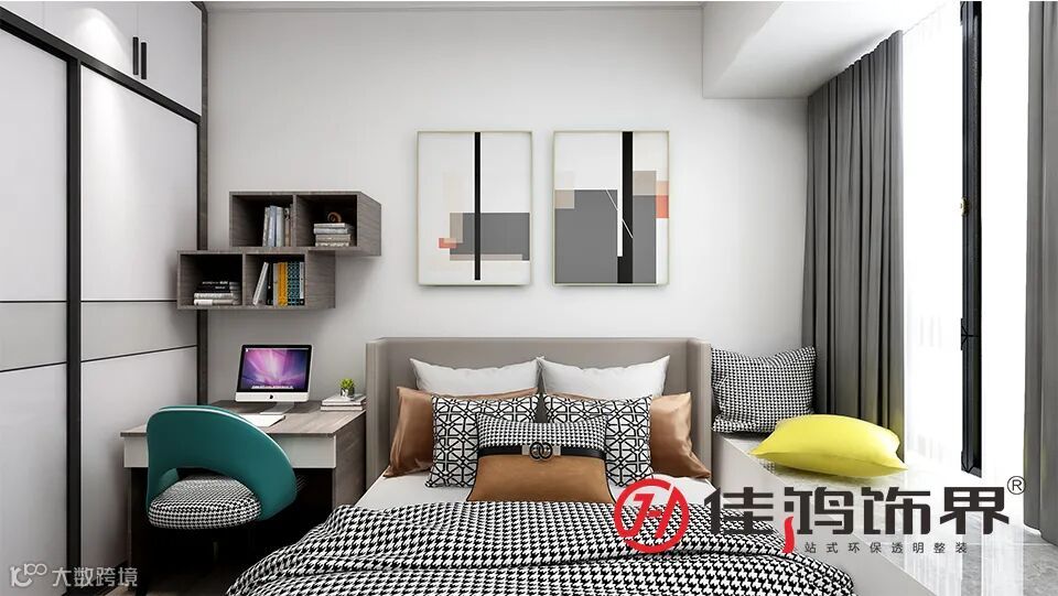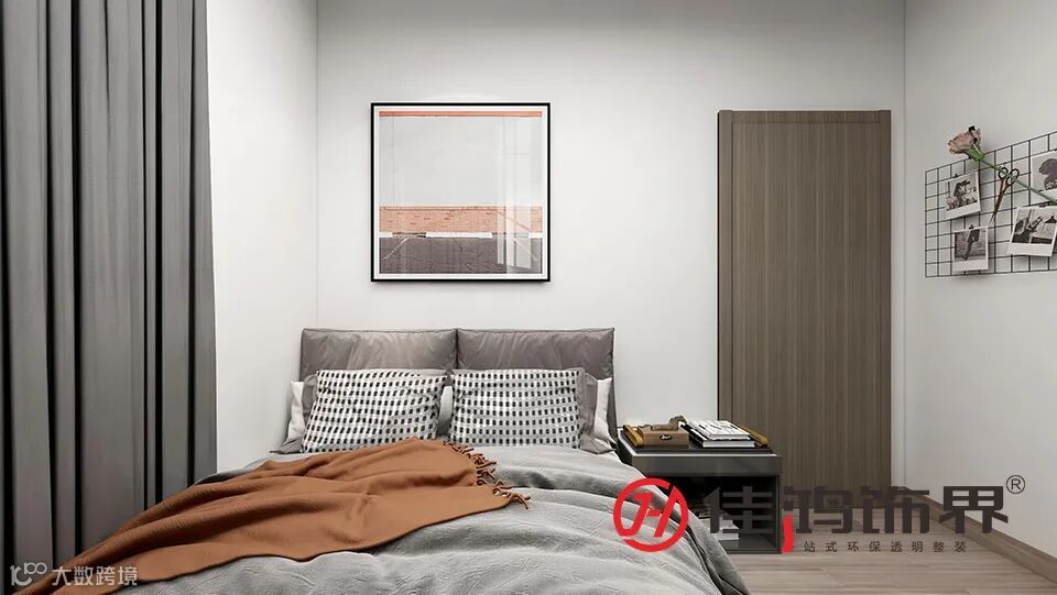 ▲次卧,延续了白色的主基调,用千鸟格纹床单和抱枕为空间添彩,打造出清新自然的舒眠环境。定制了书桌架+衣柜的组合,满足日常阅读和收纳的基本需求。