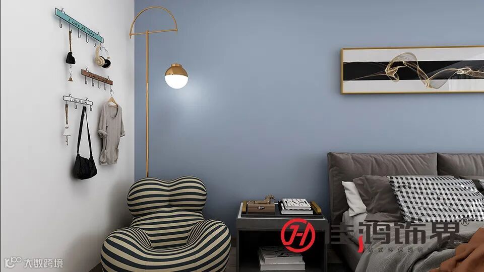 ▲布置上酷似仙人掌的单人椅,身后是可充当阅读灯的落地灯,或躺或坐,或看书或小憩,都十分惬意,墙上是三排挂钩,用来放置日常更换的衣服、包包、挂饰等,十分方便,又为卧室增加了储物空间。
