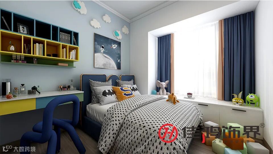 ▲儿童房整体的风格比较活跃,明亮和童趣是必要的,因此选择了雅淡蓝色的背景墙,色调比较温和。黄蓝绿组合的书桌为学习带来乐趣,平时也可以躺在窗边的飘窗柜上玩耍看景。搭配可爱趣味的卡通抱枕,有趣的同时也充满了未来感。