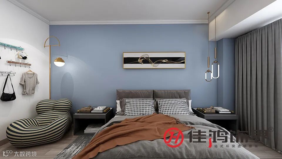 ▲主卧用了色彩的深浅搭配来做层次处理,飘台拆掉后空间更显开阔。金属铜吊灯点缀给就寝空间增加一丝暖意,通过光与材质肌理的关系表达空间的和谐与纯粹。