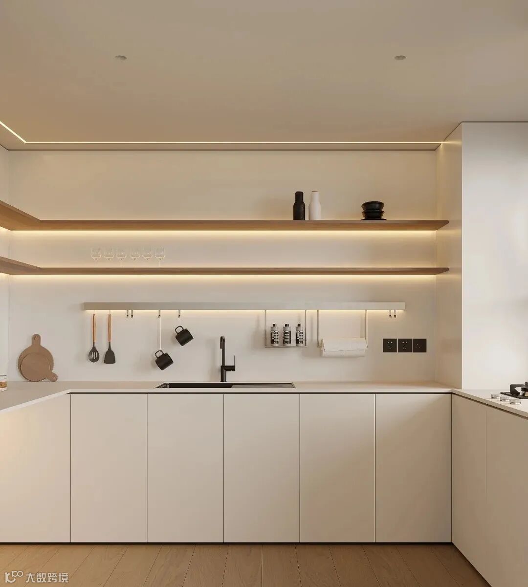 推拉门在一个平面上进行开合,分为双滑门、单滑门、吊滑门三种。这种开门方式,在颜值上更高,对居家氛围风格的打造也更容易,不过缺点就是推拉门比较占用平面的空间,一般需要更加开阔的空间。另外,推拉门的密封性不高,地轨容易落灰,清理麻烦,而吊滑门(谷仓门)密封性更差,底部会有很大的缝隙,油烟和老鼠蟑螂更容易从厨房里跑出来。