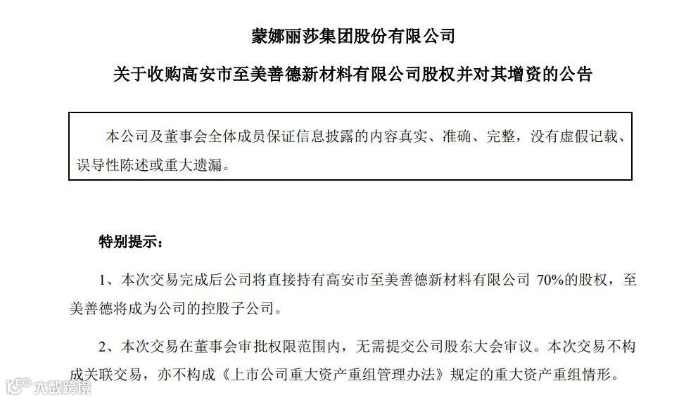 2月7日晚间,蒙娜丽莎集团发布公告,以6.51亿元收购江西普京70%股权。