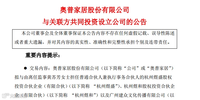 1月18日下午,奥普家居(603551.SH)发布了一则与关联方共同投资设立公司的公告。公司拟与杭州煜盛、杭州煜和、广州建众共同投资设立浙江奥普阳台科技有限公司(暂定名)。奥普阳台注册资本1000万元,其中公司拟以自有资金出资680万元,持有其68%股权。