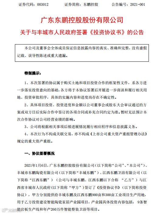 1月6日晚间,东鹏控股(003012.SZ)发布公告,公司拟投资50.8亿元,投资建设江西丰城智能陶瓷家居产业园项目。公告显示,东鹏控股联合下属公司丰城市东鹏陶瓷有限公司(丰城东鹏)、江西东鹏卫浴有限公司(江西东鹏),与江西省丰城市政府签订了《投资协议书》。