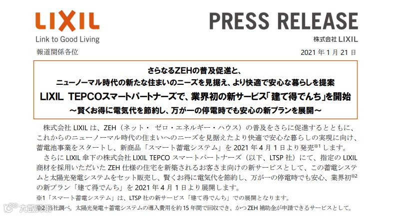 骊住集团日前宣布进军蓄电池行业,首款产品将于4月1日推出。骊住集团曾与东京电力ENERGY PARTNERS株式会社成立合资企业LIXIL TEPCO,蓄电池销售业务即由该企业负责。