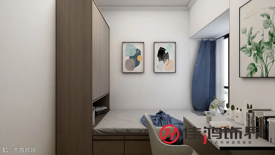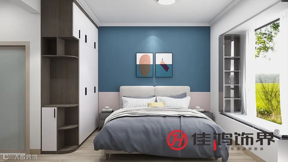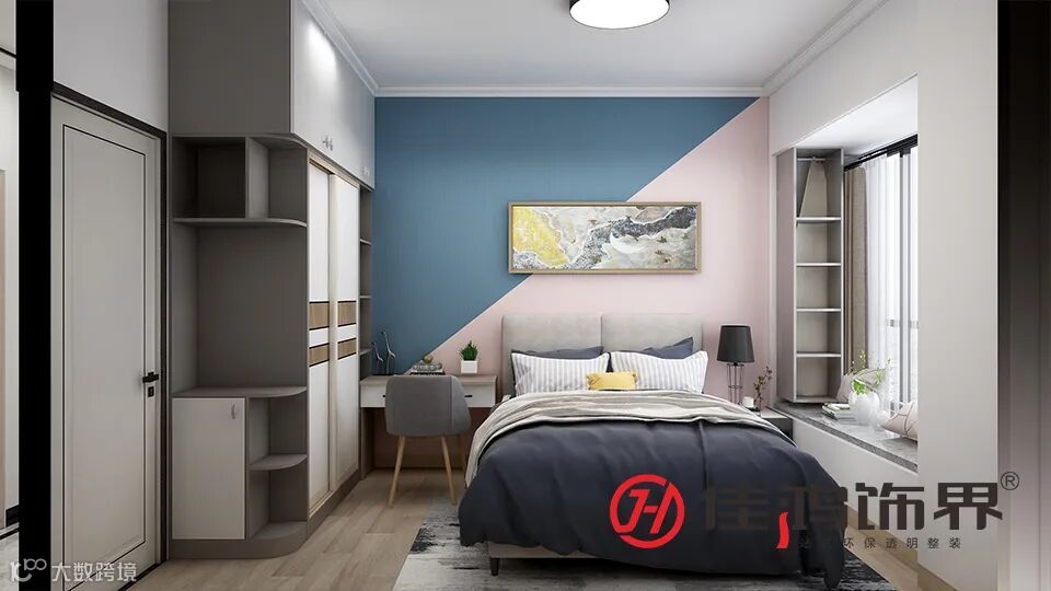▲卧室刷成了粉蓝的拼接色背景墙,软装上用的使人沉静的深蓝色。一体式的衣橱和写字桌,左边一角做成了书柜,方便收纳和整理,前面的空间刚好容纳下细脚的单椅。