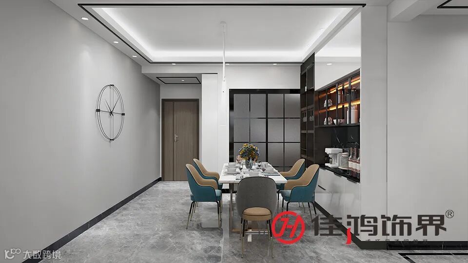 ▲客餐厅相连提升了空间视觉的延伸,使空间看起来更敞亮。同时采用黑色线条包边的吊顶和隐藏式的筒灯,过道氛围感十足,层层递进。