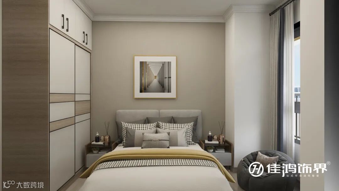 ▲长辈房选择了高背床组合衣柜和休闲沙发的设计,低矮床卧的安全性会更高一些,保留了两侧床头柜,可放置小物品。加上一张小沙发也方便长辈看看书、沐浴阳光。整体颜色以温暖米色为主,让空间干净整洁。