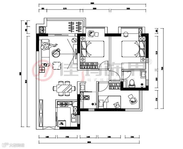 1.一个5口之家,三个卧室,分别是主卧,大次卧作为长辈房,最小房作为宝宝房。