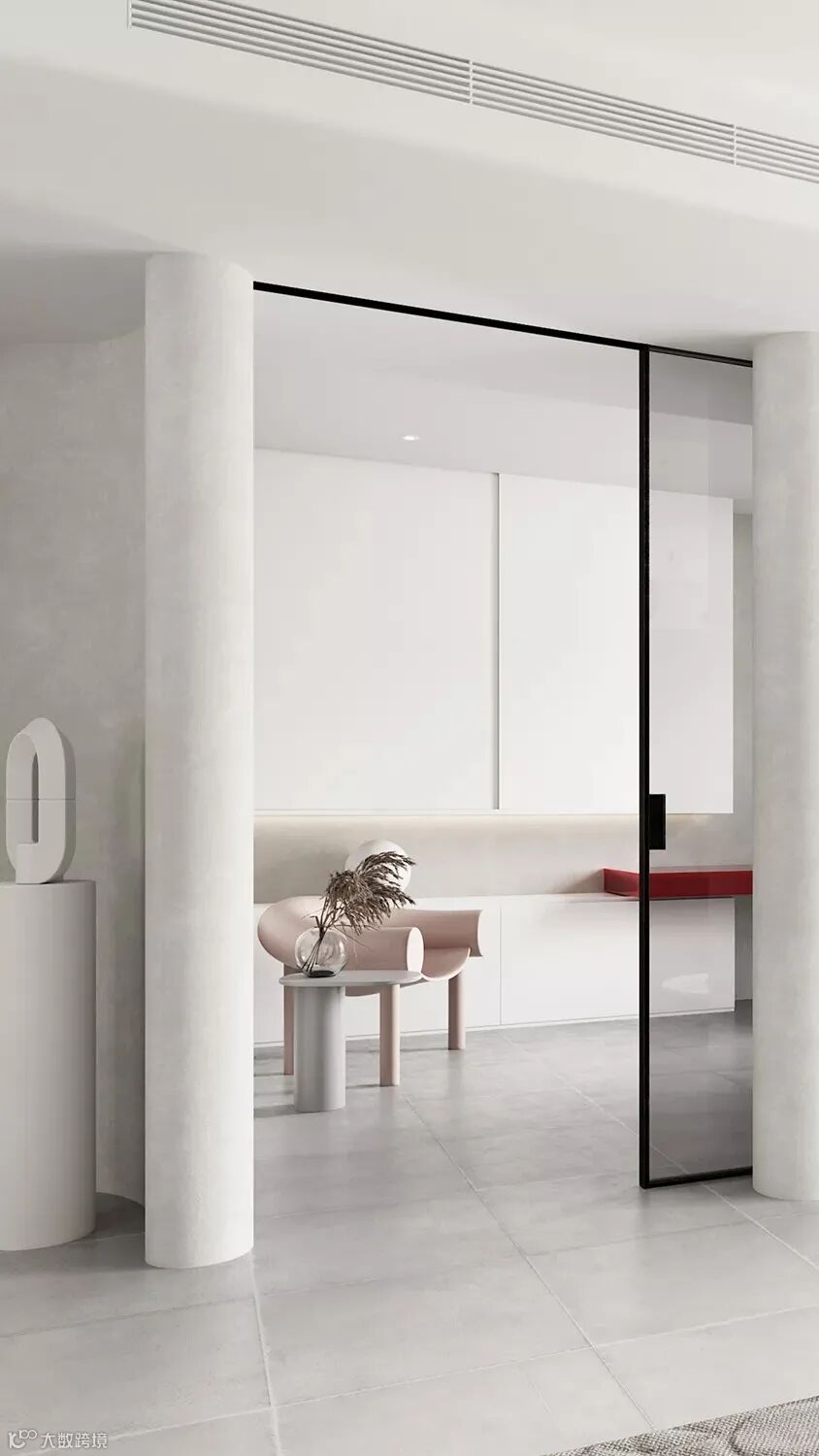 ▲餐厅区为居家生活的重心,白色餐桌配绒面餐椅,最简单的搭配却有着回归真我的触感。拼接色漆将墙面与地面融为一个整体,保持色调的统一。忙碌的早晨在餐桌享用自家的早餐,清晨应有的仪式感,让生活更有情调。
