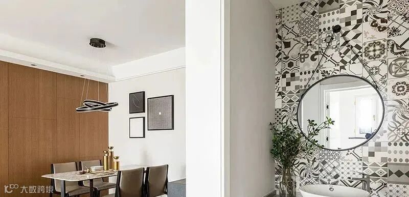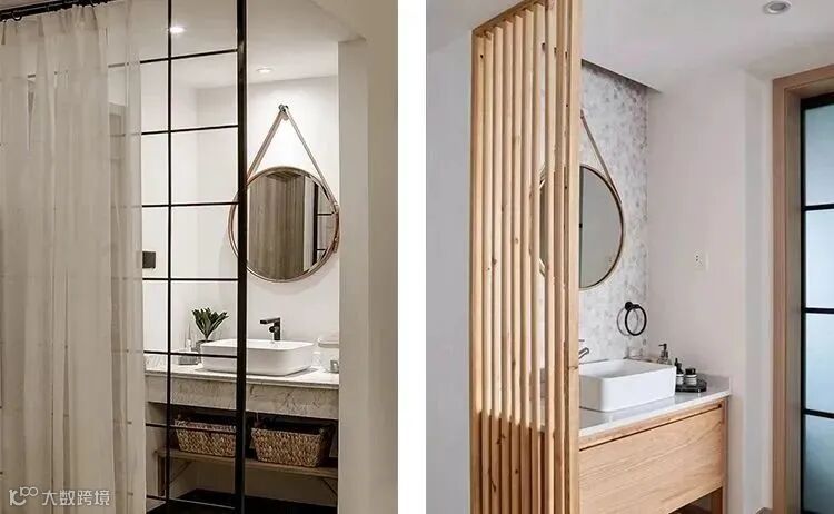 洗手台外移后,可能会觉得光秃秃有点不美观,所以空间足够的话,可以做上隔断进行遮挡,像是黑框玻璃、镂空隔断都是个不错的选择。