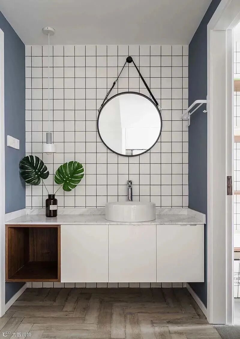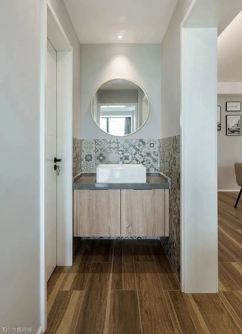 和墙面一样,地面也建议使用瓷砖,如果要铺木地板的话,记得在洗手台旁边安好门槛石,让两种材质得到分隔的效果。