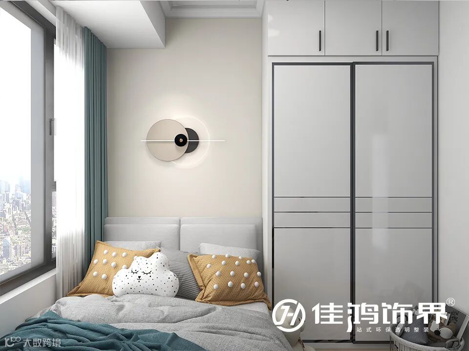▲儿童房用艺术层叠圆形灯代替传统床头灯,让整个房间多了一丝现代简约时尚设计的风采;浅灰色的衣柜和床头设计,精巧的构思将整个空间连通到了一起,布置色彩饱和度高和云朵造型的抱枕,有些许跳跃的灵气。