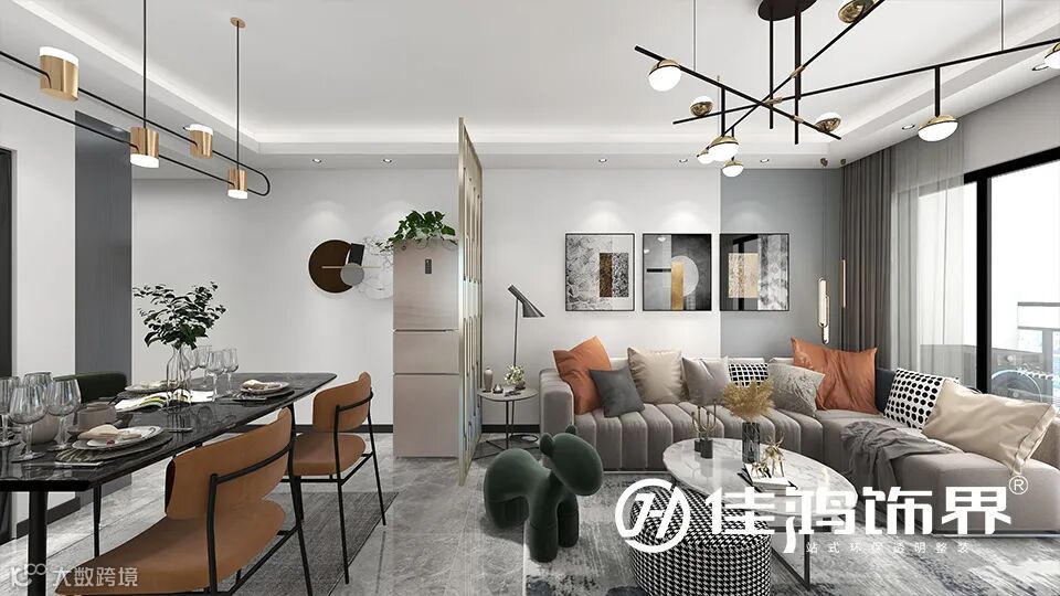 冷色系的墙面乳胶漆,客餐厅灰色抛光地砖,卧室木纹地砖构成了整体的大空间,软装上,选取了现代时尚的爱马仕橙等色构造舒适的家居氛围。