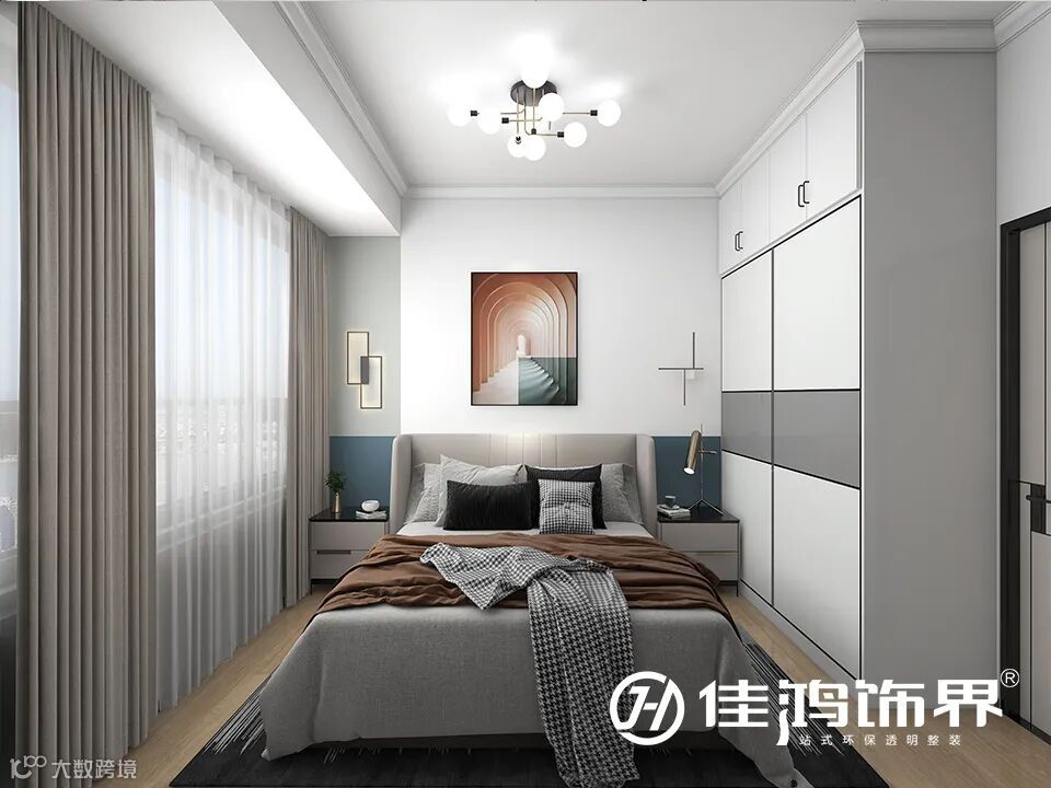 ▲在卧室里,由浅入深的颜色搭配营造出丰富的层次,线条壁灯的黄色灯光带一圈弧度,点缀着墙面,让空间更具氛围感;靠窗一侧,将墙面由白色漆成了青色,拉长了床头背景与飘窗为一体,大面积的窗幔,轻薄而透亮。
