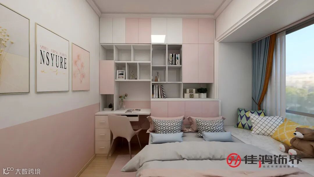 The pink and white background wall is like a color matching board, and the jumping colors bring fun; the desk and the display cabinet are integrated, which not only saves space, but also enhances the storage function. The fresh and sweet atmosphere is accompanied by delicate roses. Make the learning process more enjoyable; the bed is connected with the bay window, and the bright colors and the embellishment of the little brown bear create a rich sense of spatial hierarchy.