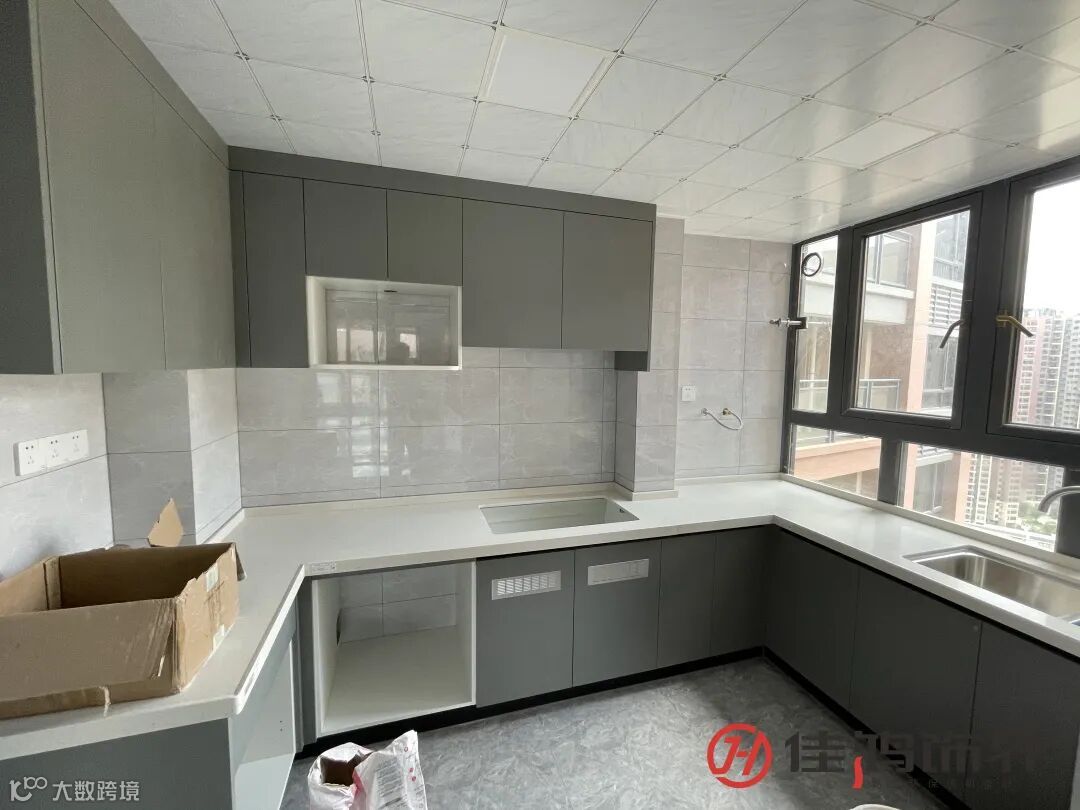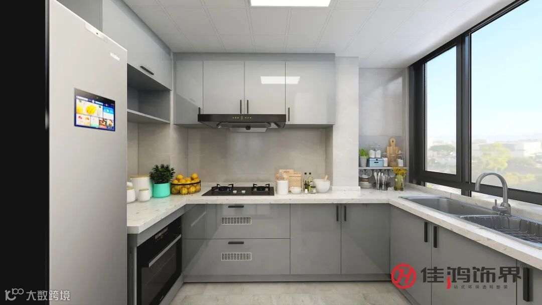 The kitchen with large windows is very transparent, the gray-based space is clean and bright, and the U-shaped design maximizes the use of space; the refrigerator is neatly designed in the room, and the upper cabinet is hollowed out for easy retrieval, practical and considerate.