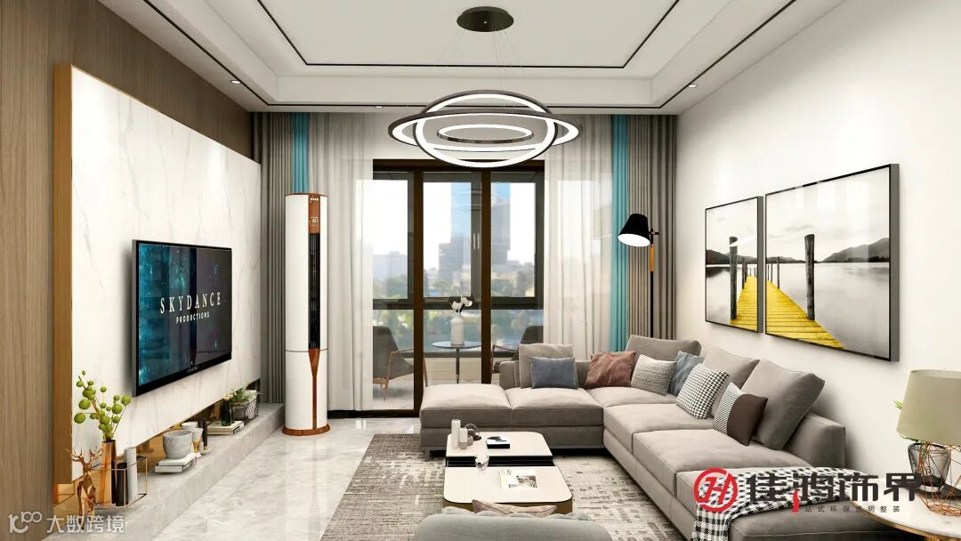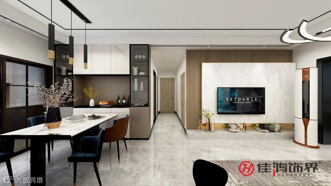 The living room space is dominated by leisure and family interaction functions. The TV scenery wall is a combination of marble and wood finishes, combined with gray carpets and sofas, which brings a sense of high-end fashion space; the sofa wall is on the elegant white wall. Basically, the decorative paintings on the bridge deck and river view also make the space appear quiet and elegant.