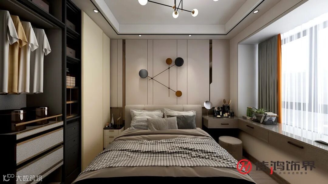主卧|精致的硬包背景墙搭配金属线条和创意圆形作为装饰,表现出了轻松和典雅浪漫的品位;布置上绵软高级棕的床卧,用心给业主营造一个温馨、自然的睡眠环境;在低调有质感的配色氛围中,融入L型的化妆台加飘窗,自然的肌理焕发独特的气息。
