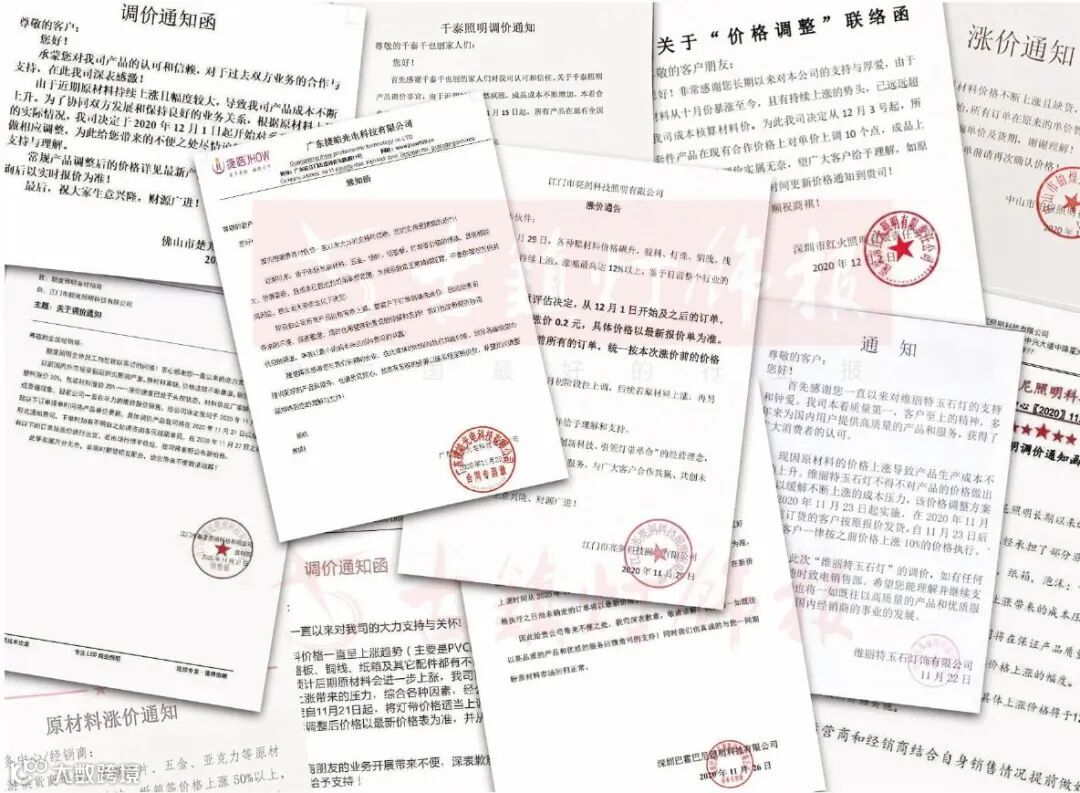 在原材料上涨的“压迫”下,从11月10日开始,无论是微信群,亦或是朋友圈,都可以陆陆续续看到索蓝照明、聚朗照明、简优照明、千泰照明、华艺照明、捷皓光电、留虹照明、奥奇特照明、康晖照明、南扬照明、松泽照明、靓度照明、钜豪照明、光代源照明、亮剑照明、德士尼、极美照明、顶上明珠等数十家LED照明灯饰企业,先后以通知形式对外宣布即将“提高出厂价格”。