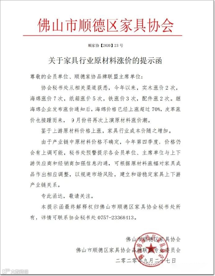 9月27日,广东佛山市顺德区家具协会发布《关于家具行业原材料涨价的提示函》,今年以来,实木涨价2次,海绵涨价7次,纸箱涨价5次,配件涨价2次。提示函称,由于原材料上涨,今年第四季度产品价格有可能上调,提醒企业做出价格价格调整以应对市场风险。