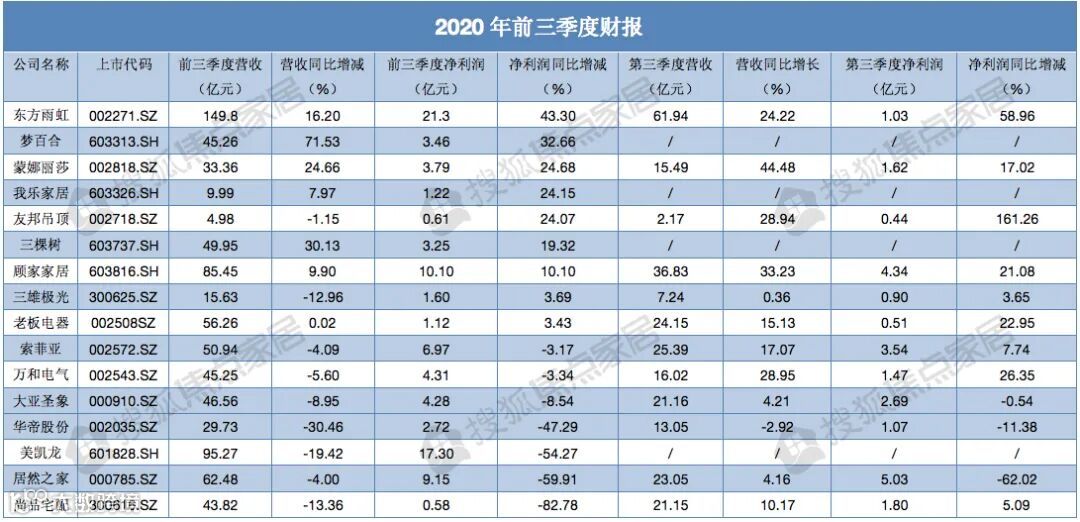 多个家居企业近日发布了2020年前三季度财报,搜狐焦点家居根据最新的公开报告进行汇总,发现各家居企业三季度整体营收成增长态势。