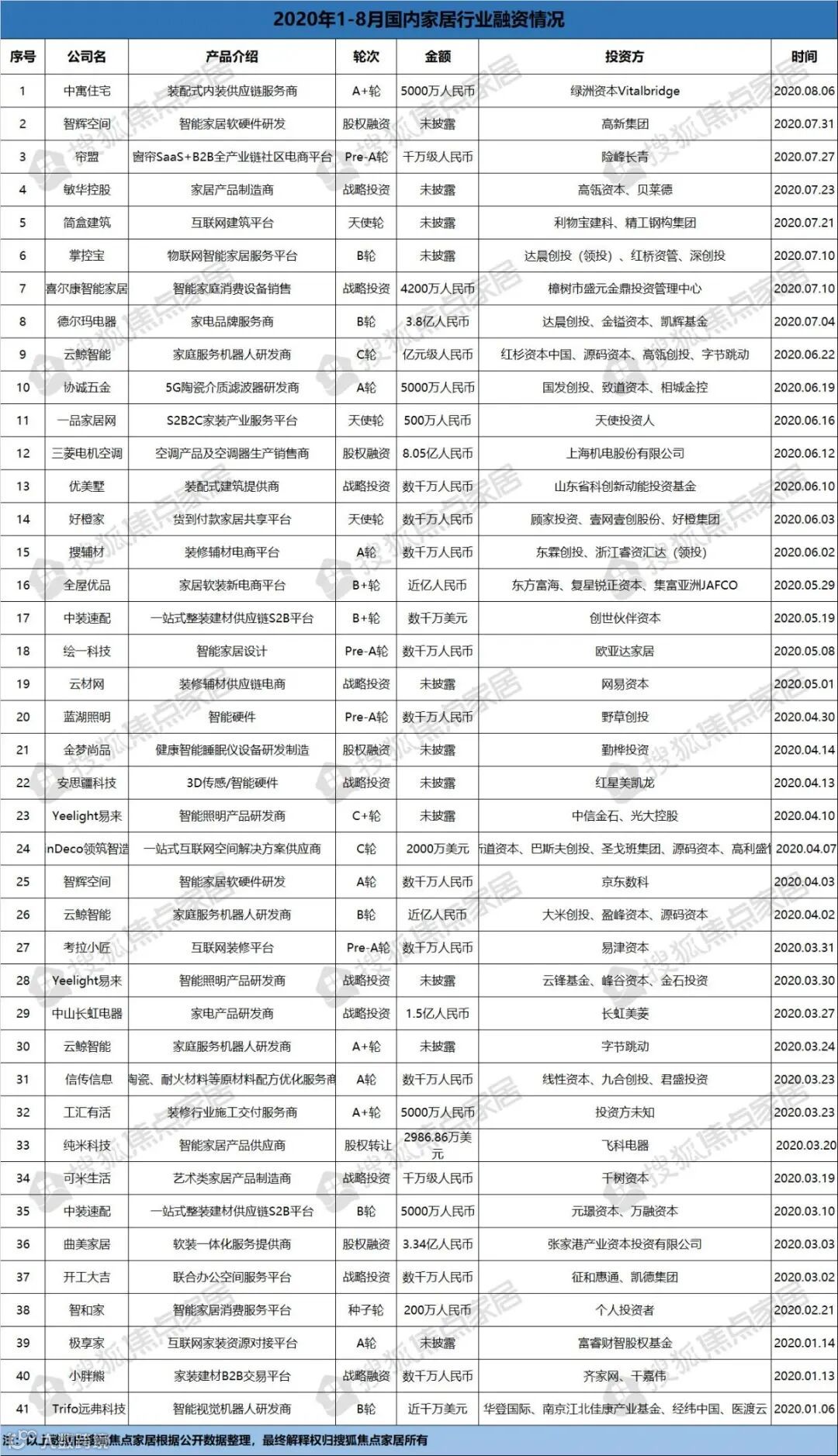 2020年上半场开局不利已成定局,资本市场的持续活跃却为低迷的家居行业注入了一针强心剂。搜狐焦点家居根据公开资料整理,截止到目前为止家居行业共发生投融资案例41起,融资规模数十亿人民币。风起云涌的资本市场背后,大笔资金究竟流向家居哪些领域?谁又是最受资本“偏爱”的胜利者?