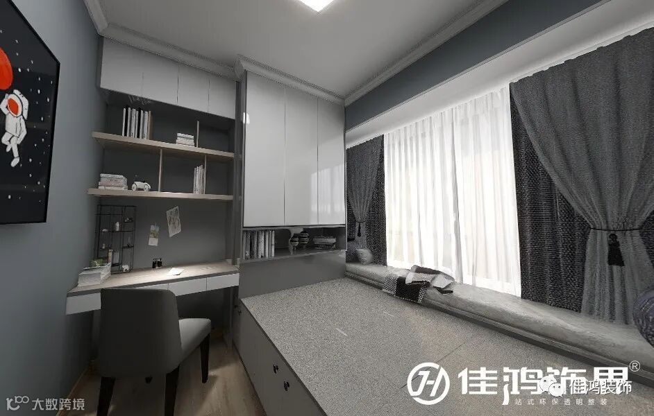 ▲主卧|灰色的基调,突显沉稳和质感。连接着榻榻米的一体式桌柜,小巧而灵活,使空间得到了更有效的利用。白天,是轻如羽翼的薄帘,随风而动,到了夜晚,拉上遮幕,梦里便是宇宙无穷,浩瀚星空。