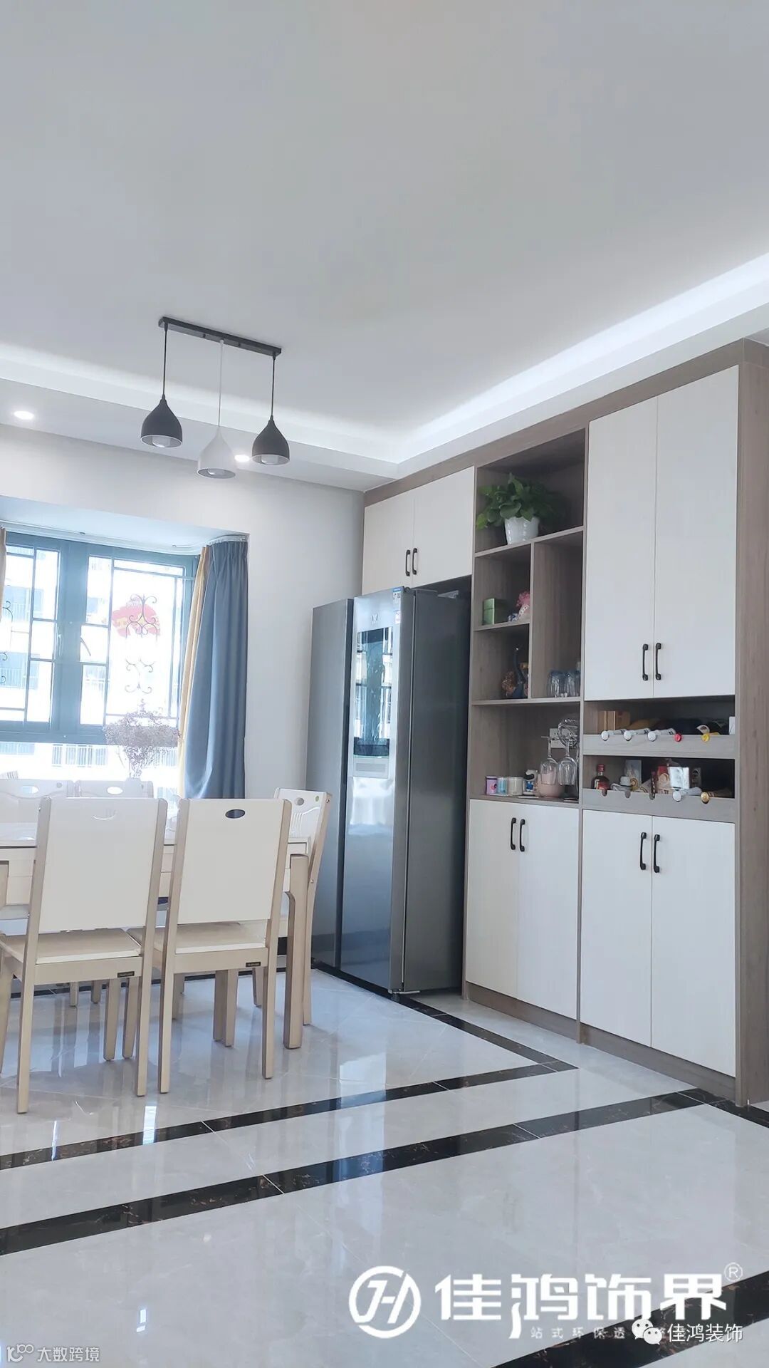 ▲ 餐厅|格橱组合,装饰品和物件摆放整齐有序,形似天秤的吊灯,典雅而不失趣味。在一天繁忙的工作后,干净简洁的乳白色用餐环境更能抚慰疲倦的心。