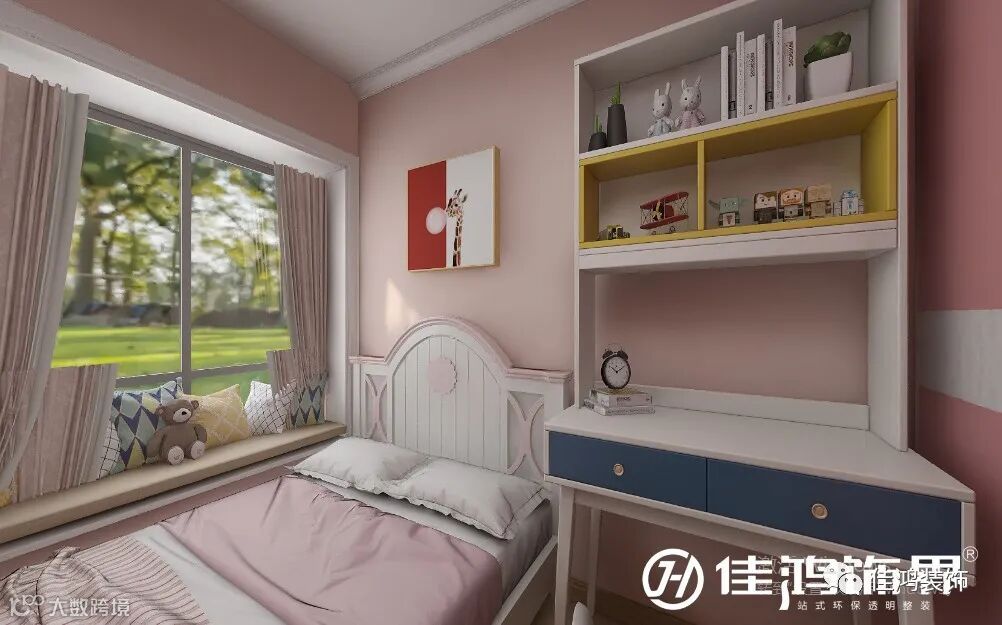 ▲ 儿童房|女孩儿是那娇嫩的粉调,又愿她拥有小太阳般的橙黄色,明亮活泼,温暖向上,简约欧式小床,充满童趣的吐泡泡长颈鹿,没有过多的繁饰,只有寄予的最美好愿景。