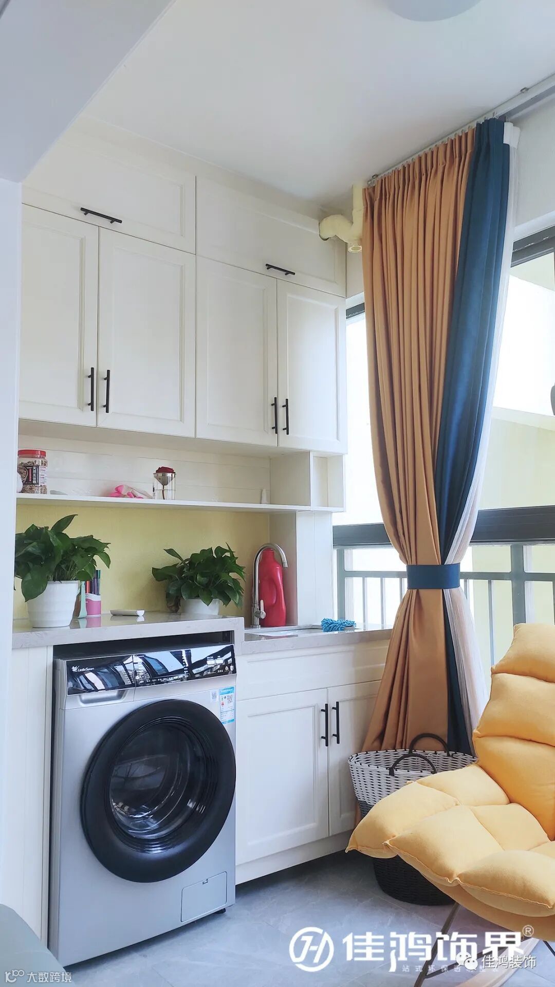 ▲ 阳台|内嵌式洗衣机,与上方橱柜一同,实现了良好的收纳功能,即使是在等待的间隙,也能斜靠在绵软的布艺单椅上,放缓节奏,舒展身体。