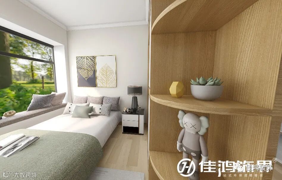 ▲ 次卧|大大的飘窗,清新的绿意扑面而来,原木材质的地板和圆弧型侧柜,是与自然的又一次亲密接触,光脚轻踩,便能感受那一份舒适与惬意。对称的叶子脉络简画,平添了丝丝灵动的艺术感。