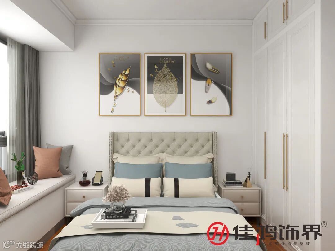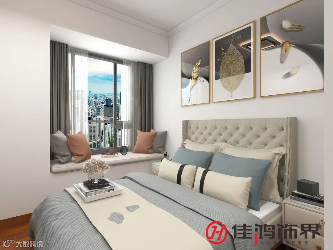The bedroom adopts white latex paint, and the high-back soft sleeper is matched with the hard-wrapped bedside cabinets on both sides to form an open and bright resting environment; the orange-gray color of the bay window enhances the sense of activity at home, and it is easier to reveal the high-end fashion home atmosphere under the rendering of lighting.