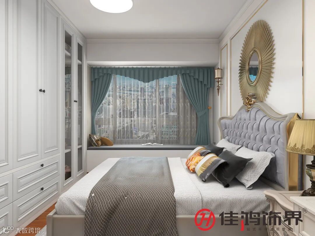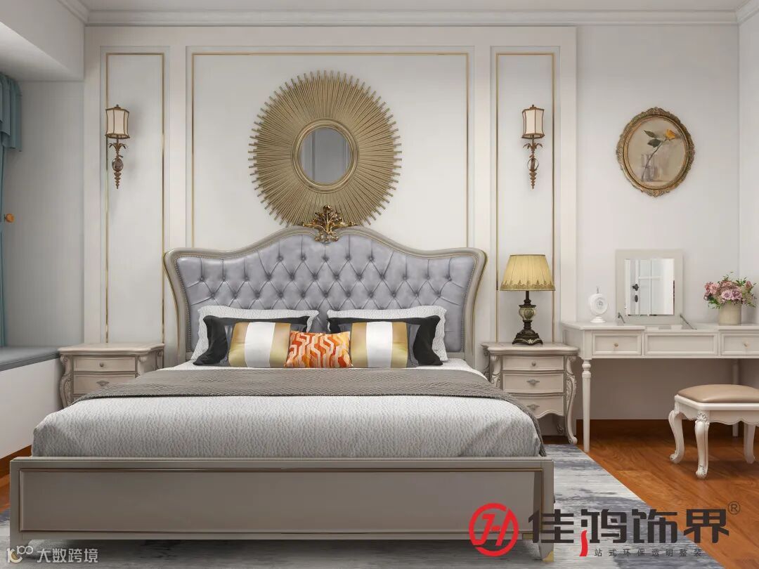 The design of the master bedroom is both elegant and retro European style, and full of modern and simple fashion sense. Golden sunglasses on the background wall and wall lamp decoration add retro light luxury to the space.