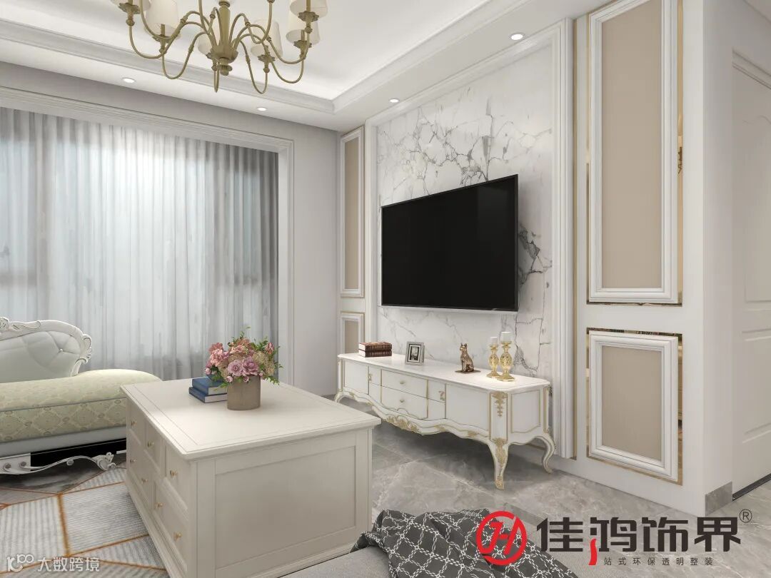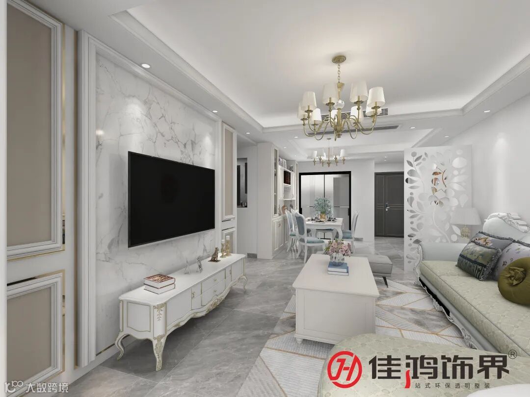 The living room adopts a unique textured marble background wall, plaster and metal lines for decoration, luxurious and elegant palace lamps, and modern carpets echo each other.