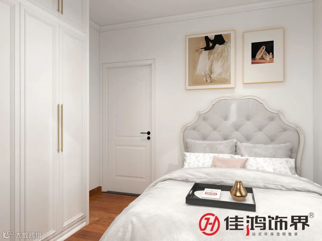 The bedroom used for resting has a comfortable and casual temperament; the background wall adopts the paintings of ballet girls with white finishes, which correspond to the stable floor, giving people an artistic and warm and comfortable feeling; high-grade gray bed head, and metal The texture of the aromatherapy jointly composes a transparent and fast relaxation.