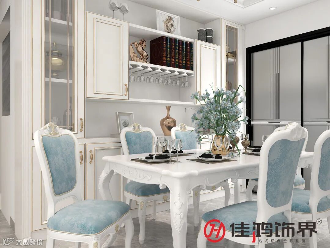 ▲餐厅整体风格以欧式为主,装饰华丽,色彩的运用上纯真的象牙白搭配天空蓝,在欧式的奢华大气的大环境下,辅以蓝色带来的清新感觉,使整个就餐空间变得活泼生动,又极其温馨。