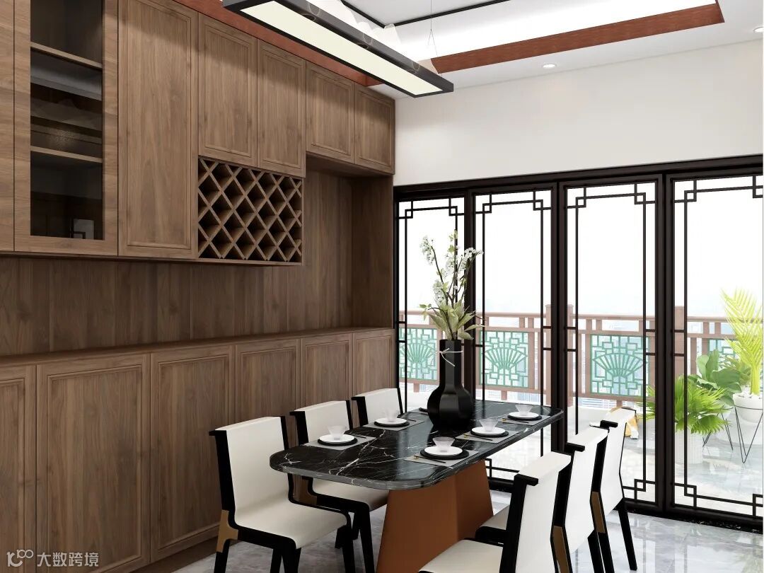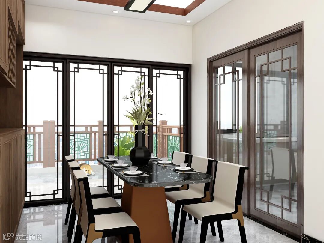 餐厅|木质栅格栏橱柜与和中式推拉门让餐厅空间更显大气,黑金花纹岩板餐桌完美的嵌入,整体更加和谐美观,饰以盛放的小花蝴蝶结花瓶,不仅有中式家居的传统韵味,也更加符合现代居住环境的生活特点,让古典与现代完美结合,传统与时尚并存,让整个空间简单又不失品味。