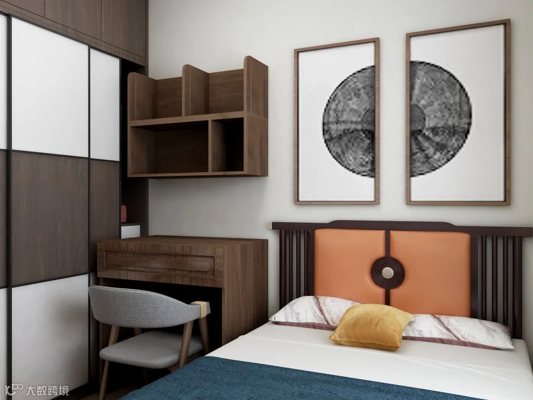 次卧|在相对安静的休息的卧室,原木的书桌和床,都让家变幻成一个雅致的世界,细节处的雕刻,也彰显着中式圆合之理的魅力。
