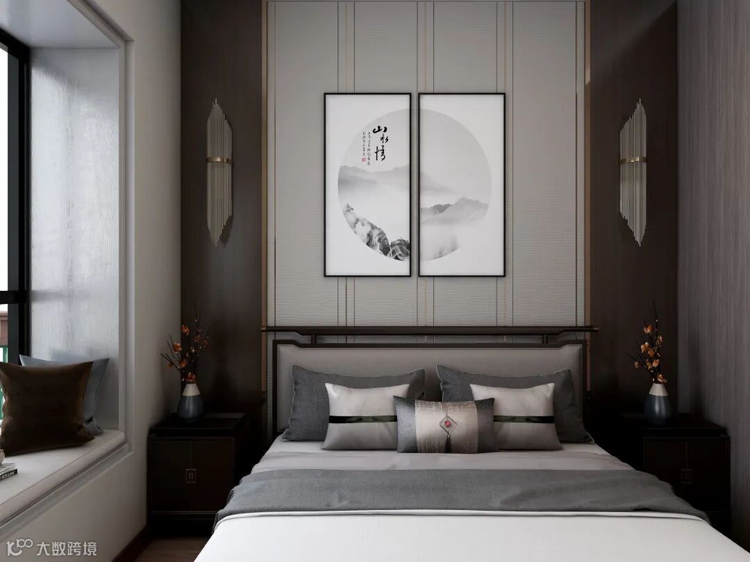 主卧|背景墙采用简约造型的设计,以极简造型、清晰的线条来衬托出新中式的美感,加入壁灯和灰色硬包床头等高品质的现代材质,没有多余点缀,也没有刻意雕琢,就能让空间展现出大家风范,尤其沙发背景采用泼墨山水装饰画,让客厅空间既有雅致的情调,又有传统中式的高贵色调。